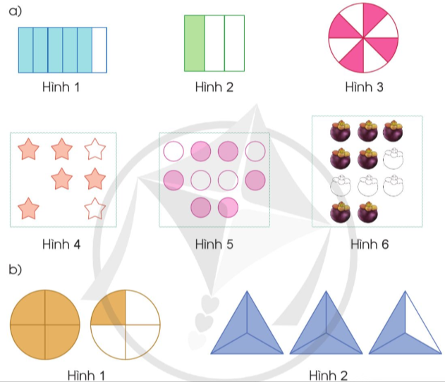 a) Hình 1: $\frac{5}{6}$    ;     Hình 4: $\frac{5}{7}$