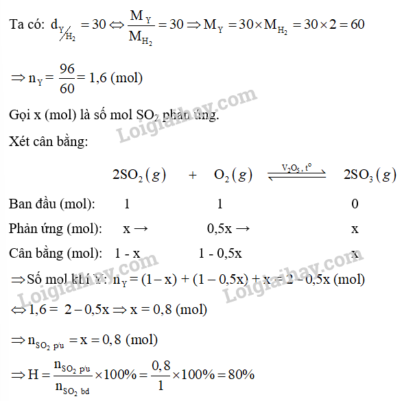 Hỗn hợp X gồm SO2 và O2 có tỉ khối so với H2 bằng 24. Nung nóng X trong bình kín chứa xúc tác V2O5, thu được hỗn hợp khí Y có tỉ khối so với H2 bằng 30. Viết phương trình hoá học và tính hiệu suất của phản ứng oxi hóa SO2 thành SO3.