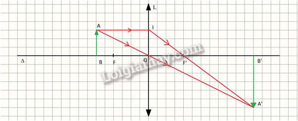 – Vẽ ảnh thật A’B’ có độ cao 6 ô đặt trước thấu kính, vuông góc với trục chính, có điểm B’ nằm trên trục chính và cách thấu kính 12 ô.