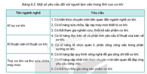 Từ bảng 9.1, em hãy tóm tắt các đặc điểm một số ngành nghề phổ biến thuộc lĩnh vực cơ khí.