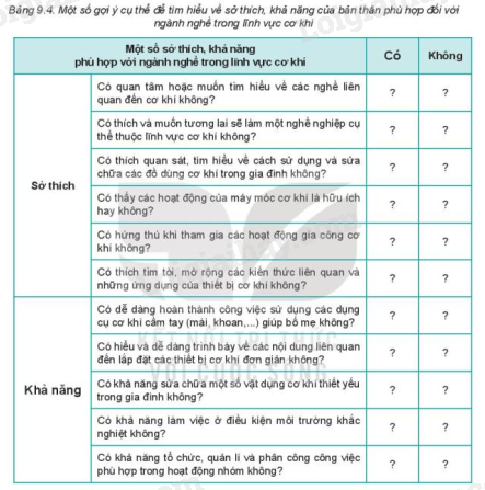 Dựa vào một số gợi ý ở Bảng 9.4, hãy lập bảng liệt kê những sở thích và khả năng của bản thân có thể phù hợp đối với ngành nghề trong lĩnh vực cơ khí.