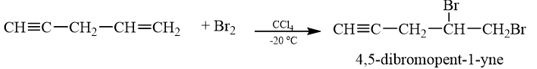 b) Khi cho hydrocarbon trên tác dụng với bromine trong CCl4 ở −20 °C thu được 4,5-dibromopent-1-yne theo phương trình phản ứng: