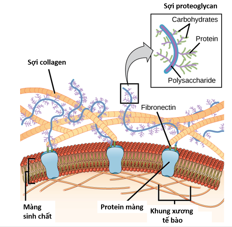 Chất nền ngoại bào có cấu tạo phức tạp gồm các phân tử proteoglycan kết hợp với các sợi collagen tạo thành mạng lưới bao bên ngoài tế bào.
