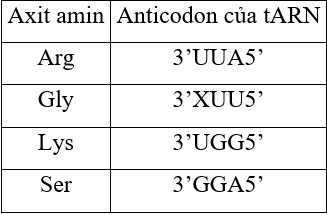 … Gly – Arg – Lys – Ser … Bảng dưới đây mô tả các anticodon của tARN vận chuyển axit amin: