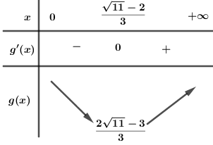 \(\begin{array}{l}g’\left( x \right) = 0 \Leftrightarrow {\left( {3x + 2} \right)^2} = 11 \Leftrightarrow x = \frac{{\sqrt {11} – 2}}{3}\,\,\left( {do\,\,x > 0} \right)\\g\left( {\frac{{\sqrt {11} – 2}}{3}} \right) = \frac{{2\sqrt {11} – 3}}{3}\end{array}\)