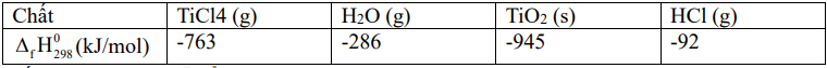 \({\Delta _r}H_{298}^0\)= \({\Delta _f}H_{298}^0(Ti{O_2}) + 4.{\Delta _f}H_{298}^0(HCl) – {\Delta _f}H_{298}^0(TiC{l_4}) – 2{\Delta _f}H_{298}^0({H_2}{\rm{O}})\)