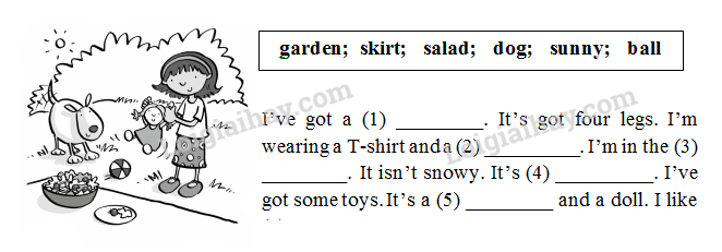 I’ve got a dog. It’s got four legs. I’m wearing a T-shirt and a skirt. I’m in the garden. It isn’t snowy. It’s sunny. I’ve got some toys. It’s a ball and a doll. I like salad.