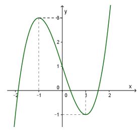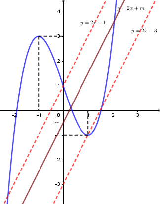 Quan sát hình vẽ ta thấy, với \( – 3 \le m < 1\) thì đường thẳng \(y = 2t + m\) cắt đồ thị hàm số \(y = f\left( t \right)\) tại đúng 1 điểm có hoành độ thuộc \(\left( {0;1} \right]\).