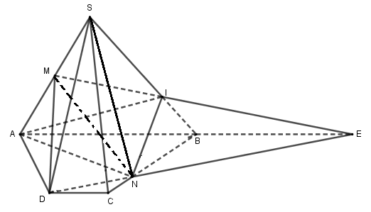Câu 14: Cho khối chóp \(S.ABCD\) có thể tích bằng \(2{a^3}\), đáy \(ABCD\) là hình thang với đáy lớn là \(AB\) và \(AB = 3CD\). Gọi \(M\) là trung điểm cạnh \(SA\), \(N\) là điểm thuộc cạnh \(CB\) sao cho \(BN = 3NC\). Mặt phẳng \(\left( {DMN} \right)\) cắt cạnh \(SB\) tại \(I\). Tính thể tích khối chóp \(A.MDNI\).