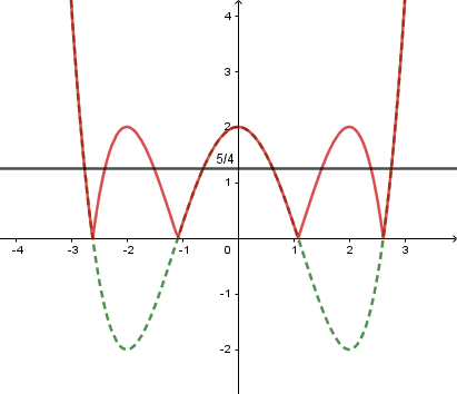 – Biến đổi phương trình đã cho về \(\left| {f\left( x \right)} \right| = \frac{5}{4}\) và suy ra số nghiệm bằng số giao điểm của đồ thị \(y = \left| {f\left( x \right)} \right|\) với đường thẳng \(y = \frac{5}{4}\)
