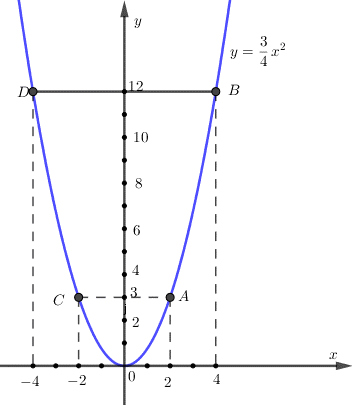 Khi đó đồ thị hàm số đã cho  là 1 đường cong và đi qua các điểm \(A\left( {2;3} \right);B\left( {4;12} \right);C\left( { – 2;3} \right);D\left( { – 4;12} \right);O\left( {0;0} \right)\)