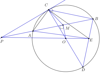 Cho đường tròn tâm O và điểm P nằm ngoài (O). Vẽ tiếp tuyến PC của (O) (C là tiếp điểm) và cát tuyến PAB (PA < PB) sao cho các điểm A, B, C nằm cùng phía so với đường thẳng PO. Gọi M là trung điểm của đoạn AB và CD là đường kính của (O).
