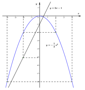 1) Vẽ đồ thị của hai hàm số \(y =  – \dfrac{1}{2}{x^2},\,\,\,y = 2x – 1\) trên cùng một mặt phẳng tọa độ.
