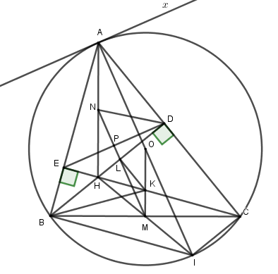 Kẻ đường kính \(AI\) của đường tròn \(\left( O \right)\) , gọi giao điểm của \(NM\) và \(ED\) là \(P.\)