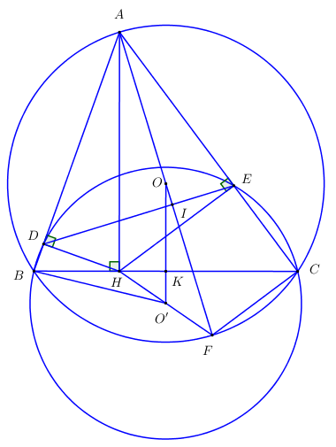 \( \Rightarrow O;\,\,O’;\,\,K\) thẳng hàng \( \Rightarrow OO’ \bot BC\). Mà \(AH \bot BC \Rightarrow OO’//BC\).