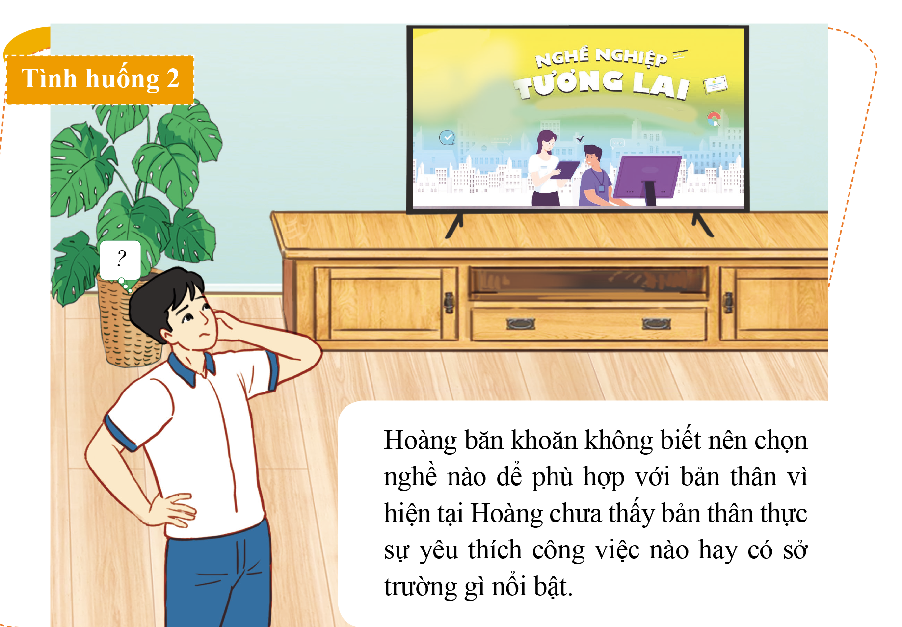 + Tình huống 2: Hoàng băn khoăn không biết nên chọn nghề nào để phù hợp với bản thân vì hiện tại Hoàng chưa thấy bản thân thực sự yêu thích công việc nào hay có sở trường gì.