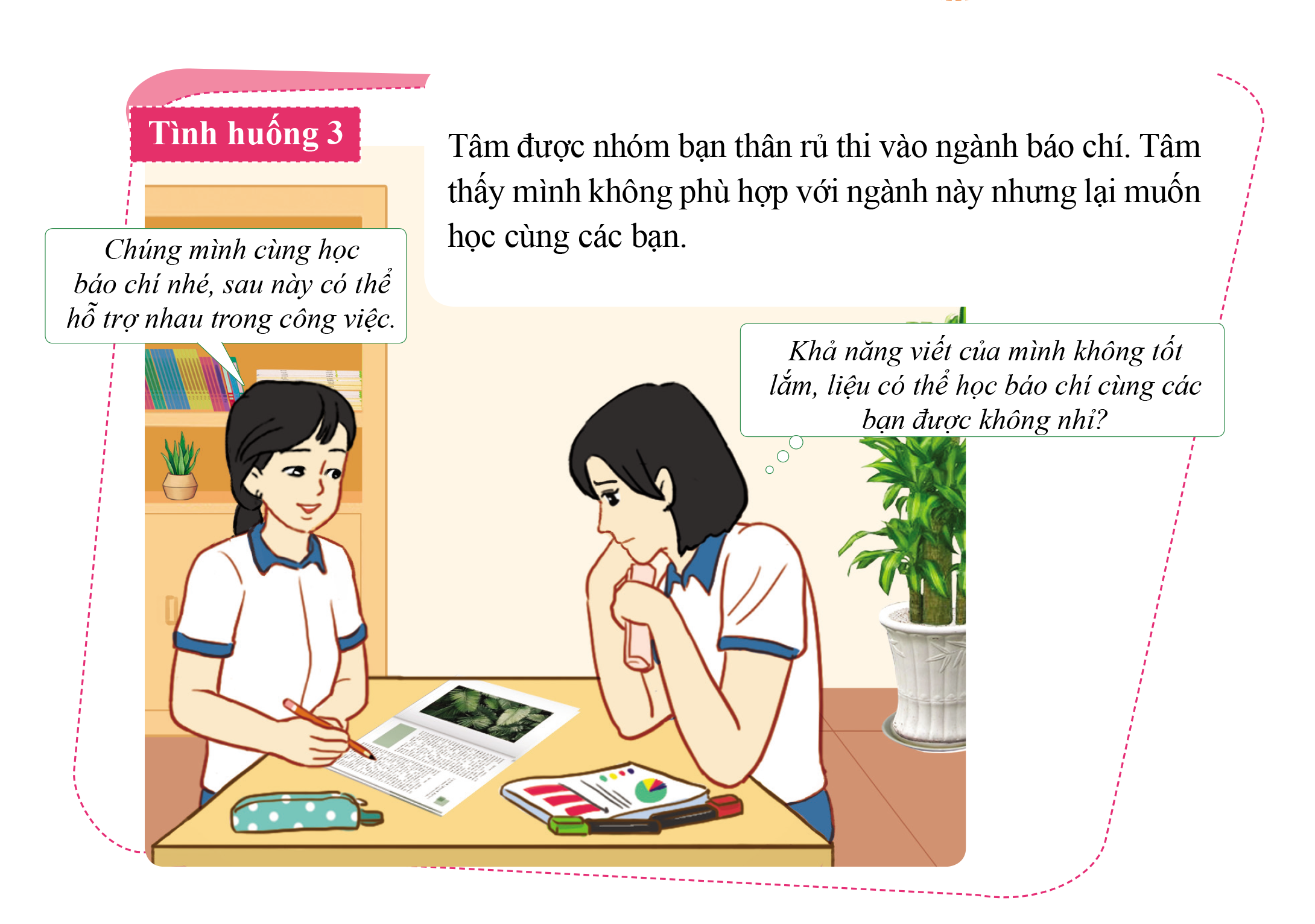 + Tình huống 3: Tâm được nhóm bạn thân rủ thi vào ngành báo chí. Tâm thấy mình không phù hợp với ngành này nhưng lại muốn học cùng các bạn.