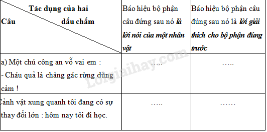 Đánh dấu X vào ô thích hợp xác định tác dụng của du hai chấm trong mỗi câu dưới đây :