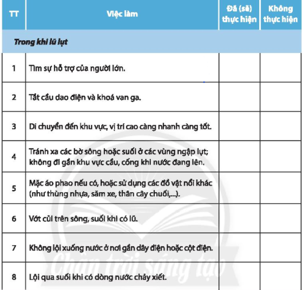 Đánh dấu tích vào ô trống chỉ những vật dụng em sẽ chuẩn bị nếu khu vực em đang sinh sống có nguy cơ mưa bão dài ngày, lũ lụt dâng cao. Giải thích lí do em lựa chọn. Đánh dấu X vào chỗ trống những việc em đã, sẽ thực hiện hoặc không thực hiện trong khi lũ lụt và sau khi lũ rút trong bảng dưới đây.