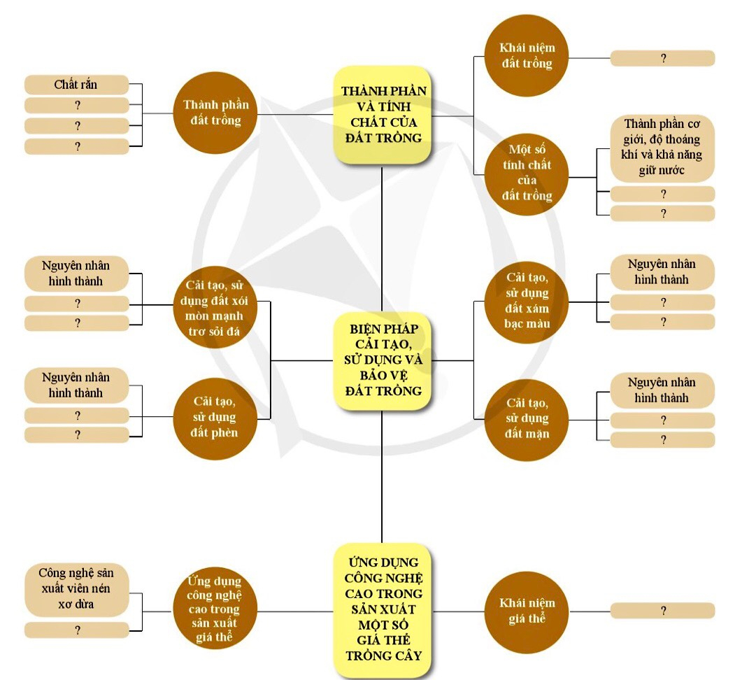 Em hãy hoàn thành sơ đồ theo mẫu dưới đây. Yếu tố nào sau đây không phải là thành phần của đất trồng? Hãy sắp xếp loại đất có tỉ lệ hạt sét tăng dần: thịt pha sét và limon,sét pha cát,thịt pha sét, đất sét,thịt pha sét và cát,thịt pha limon,sét pha limon.