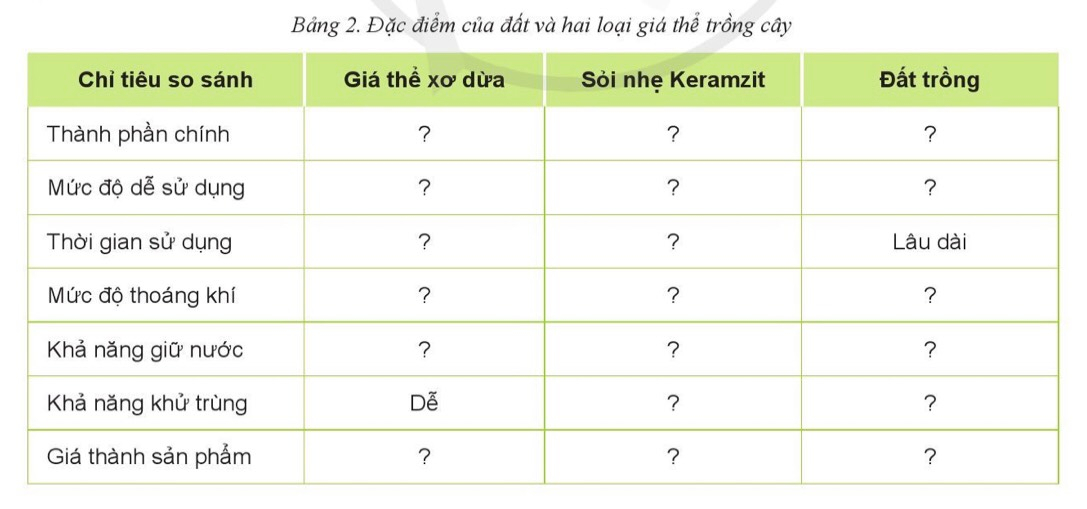 7. So sánh đặc điểm của hai loại giá thể trồng cây và đất theo mẫu Bảng 2.