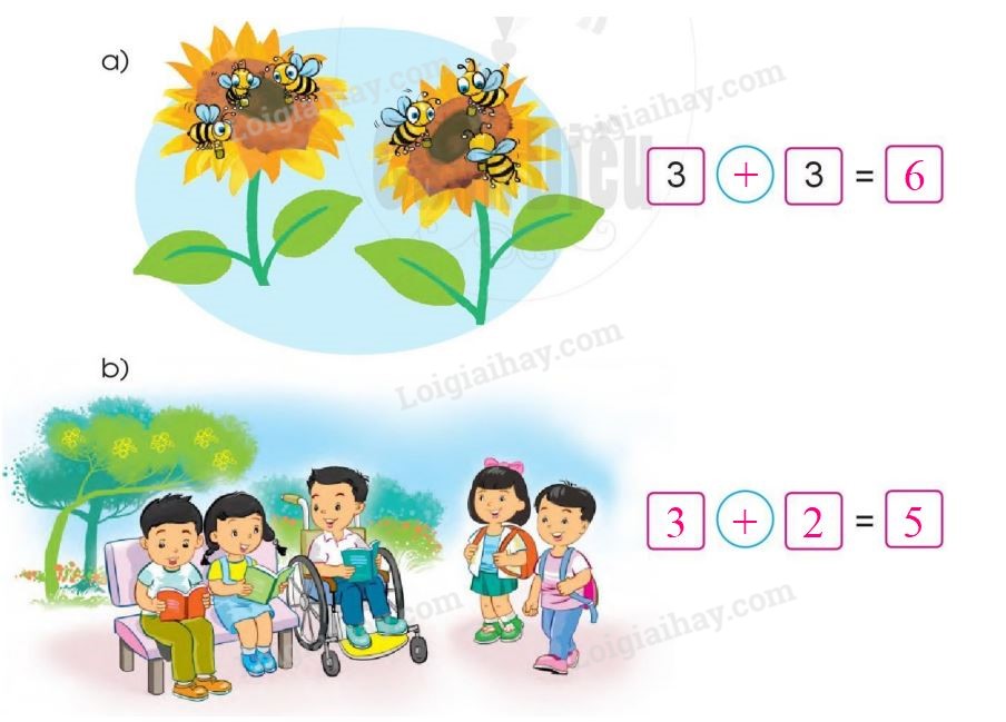 Quan sát tranh rồi viết phép tính thích hợp về số con ong trên bông hoa và số bạn trong bức tranh.