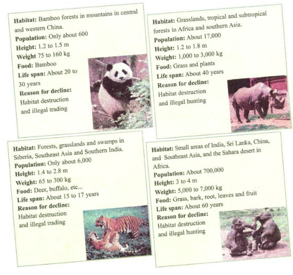 2. Work in pairs. Look at the information about the giant panda, tiger, rhino and elephant, which are endangered animals. Ask and answer questions about them.