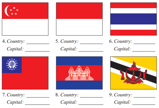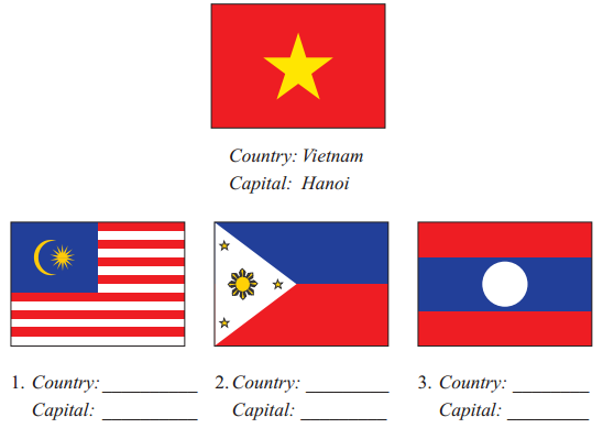 (Làm việc từng đôi. Thảo luận và viết tên của quốc gia và thủ đô dưới mỗi quốc kì.)