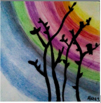 Em tưởng tượng thấy khung cảnh sau cơn mưa trời tối sầm, trước mắt là 1 màu đen của những cành cây, tuy nhiên xa xa lại xuất hiện cầu vồng sau mưa