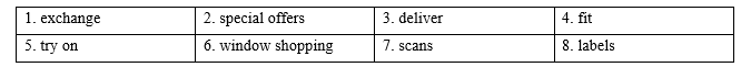 deliver – exchange – fit – labels – scans – special offers – try on – window shopping