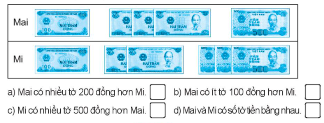 Ta thấy Mai có 1 tờ 100 đồng, 3 tờ 200 đồng, 1 tờ 500 đồng