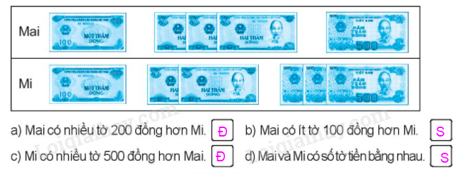 Đếm số tờ tiền 100 đồng, 200 đồng, 500 đồng hai bạn có rồi điền Đ, S vào ô trống.