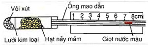 Câu 20: Trong thí nghiệm được mô tả ở hình sau: người ta thấy giọt nước màu trong ống mao dẫn di chuyển về phía trái. Điều này chứng tỏ hạt nảy mầm xảy ra quá trình hô hấp