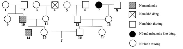 Câu 38: Cho sơ đồ phả hệ sau đây về bệnh mù màu và máu khó không. Biết rằng bệnh mù màu do gen lặn a gây ra, còn bệnh máu khó đông do gen lặn b gây ra. Các gen trội tương ứng là A, B quy định tính trạng bình thường. Các gen này nằm trên vùng không tương đồng của nhiễm sắc thể X với khoảng cách 20cm. Theo lí thuyết, có bao nhiêu phát biểu sau đây đúng?