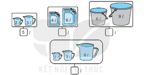 – Quan sát tranh, tính tổng số lít ở mỗi hình rồi điền vào bảng cho thích hợp.
