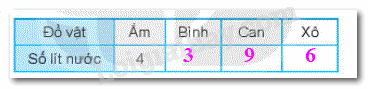 Mỗi đồ vật đựng số lít nước ứng với các ca nước bên cạnh (như hình vẽ).