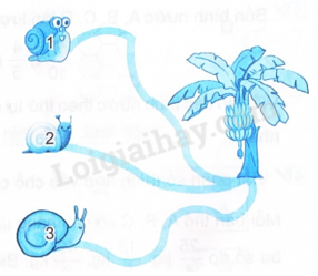 Đoạn đường từ ốc sên số 1 đến cây chuối dài $\frac{{14}}{{25}}$ m, đoạn đường từ ốc sên số 2 đến cây chuối dài $\frac{{51}}{{100}}$ m, đoạn đường từ ốc sên số 3 đến cây chuối dài $\frac{3}{5}$m.