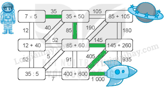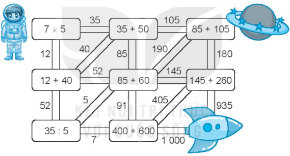 Em hãy tô màu đường đi của bạn Dũng từ vị trí đang đứng đến chỗ phi thuyền. Biết từ mỗi ô, bạn Dũng đi theo con đường ghi kết quả của phép tính trên ô đó.