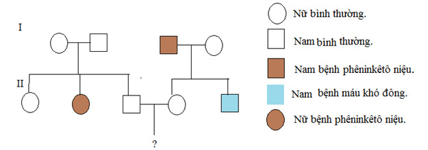 Câu 34: Ở người, bệnh phêninkêtô niệu do một trong hai alen của gen năm trên nhiễm sắc thể thường; bệnh máu khó đông do một trong hai alen của gen nằm trên đoạn không tương đồng của nhiễm sắc thể X qui định. Theo dõi sự di truyền của hai bệnh này trong một gia đỉnh qua hai thê hệ được thể hiện qua sơ đồ phả hệ dưới đây:
