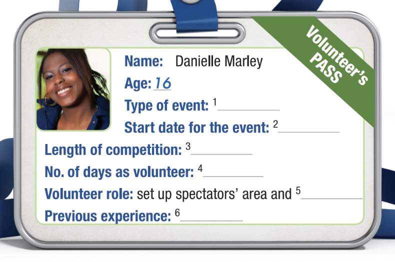 The event starts on 17 July and it lasts for two weeks. I’m only doing the first week, from Monday to Friday. I can’t do the weekend. On the first day, I’m going to help set up the spectators’ area. After that, I’m going to take photographs for the local newspaper and for the website. They’ve offered me a digital camera to take action shots and some team photos. I’m picking it up this afternoon so that I can practise with it. I’ve already won photography competitions, so I think I’ll do a good job. In the future, I’d like to study photography, so this could be very useful.