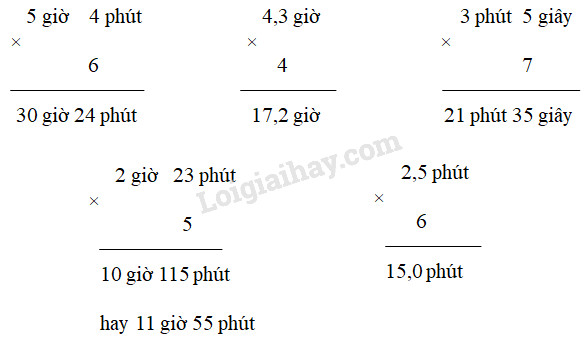 5 giờ 4 phút × 6                     4,3 giờ × 4                       3 phút 5 giây × 7