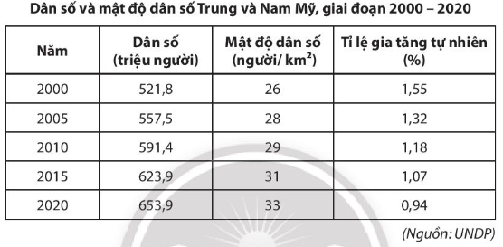 – Mật độ dân số của Trung và Nam Mỹ có xu hướng tăng lên, từ 26 người/km2 năm 2000 lên 33 người/km2 năm 2020.