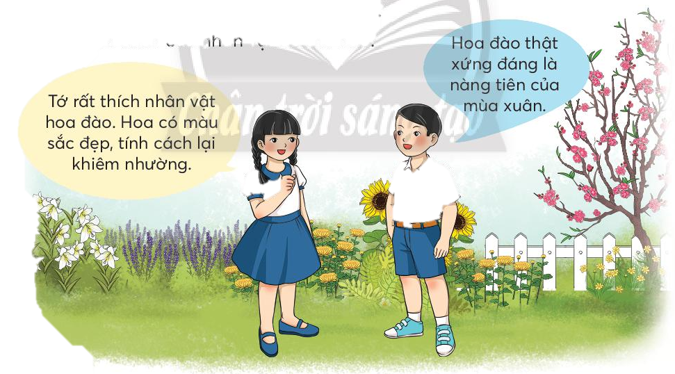 Đọc lời hai bạn trong tranh và cho biết: Hai bạn nói về nhân vật nào. Nhân vật đó có đặc điểm gì nổi bật. Tính cách của nhân vật đó thế nào. Nói về một nhân vật trong câu chuyện em thích dựa vào gợi ý