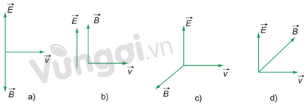 Trong các hình sau, hình nào diễn tả đúng phương và chiều của cường độ điện trường \(\overrightarrow E \), cảm ứng từ \(\overrightarrow B \)  và tốc độ truyền sóng \(\overrightarrow v \)  của một sóng điện từ?