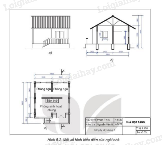 Quan sát hình 5.2 và nội dung của bản vẽ nhà để xác định các hình biểu diễn của bản vẽ hình 5.2