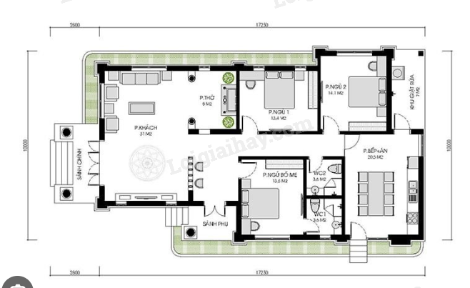 Ta thấy bản vẽ nhà trên có sự bố tri các phòng hợp lí cho sinh hoạt của gia đình và tiết kiệm không gian