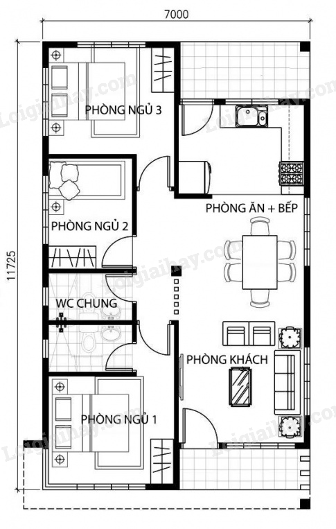 – 1 phòng khách + phòng bếp, 1 nhà vệ sinh, 2 phòng ngủ
