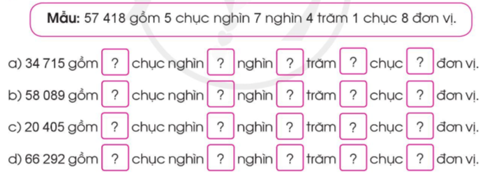 Xác định chữ số hàng chục nghìn, hàng nghìn, hàng trăm, hàng chục, hàng đơn vị rồi viết số còn thiếu vào chỗ trống.