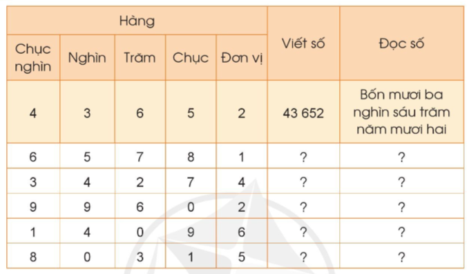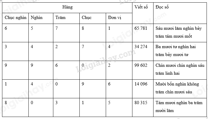 Viết số hoặc đọc số lần lượt từ hàng chục nghìn, hàng nghìn, hàng trăm, hàng chục, hàng đơn vị.