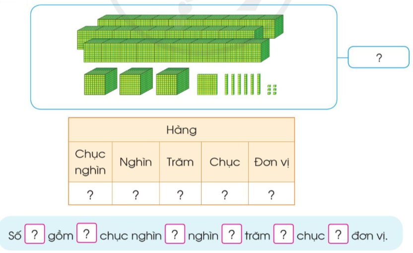 Em quan sát hình vẽ rồi xác định chữ số hàng chục nghìn, nghìn, trăm, chục, đơn vị rồi viết số thích hợp vào ô trống.
